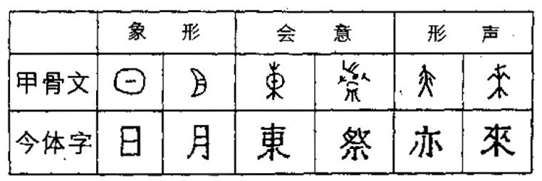左端為象形,日圓月彎,一經畫出,不待解釋。會意由象形稍加引申而成,例如日在樹後上升,是為東。雙手執雞放在樽俎之內,是為祭。還有不能圖解之觀念則可以同音字代表,如「亦」字發音與「腋」同,所以畫人之兩腋為亦。「來」與高粱之「來」同,所以畫「來」而得來。其他「轉注」、「假借」等也不外將這些基本原則重疊而擴大的使用。值得注意的則是青銅時代的書寫方式和今日報紙雜誌的鉛字一脈相傳。