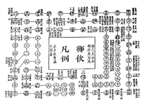 當越過那雪擁的「藍關」,可以免飲,「天台」、「太湖」也可以不喝,到了「三笑堂」,詞客與和尚、道士各盡一杯,到了唐代進士的「雁塔」題名處,必須擲「本采」的才可以通過考試,否則罰一杯,只有和尚過「雁塔」時,可以放行,古來和尚是不准參加科舉的。
