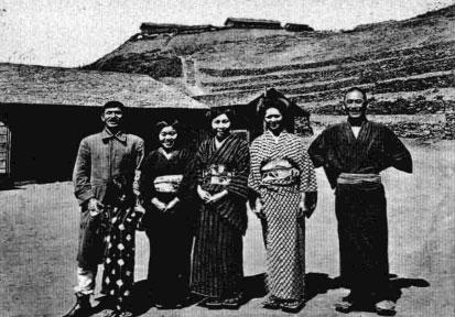(背景左青少年教育所,中是佛堂,臺階上方是馬烈巴駐在所。人物左起治平牽敏子、吉見夫人,右起吉見巡查,貝克)