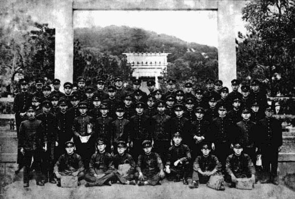 昭和7年台中師範畢業前,下山一的班級全體在台中能高神社前合影留念。