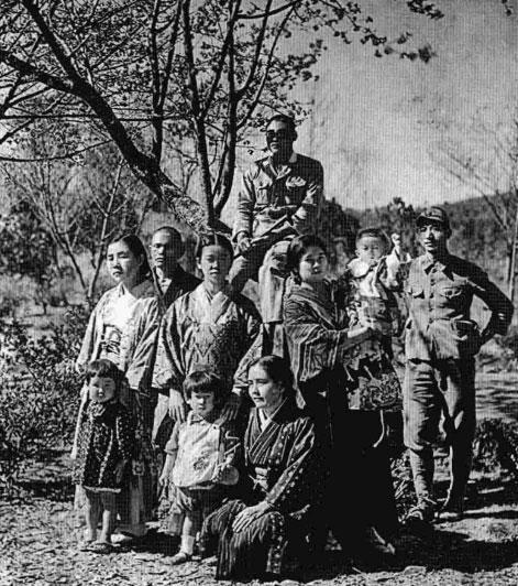 (梶原坐在樹幹上,其夫人在其前手扶和代,最右下山一和文枝抱著武)