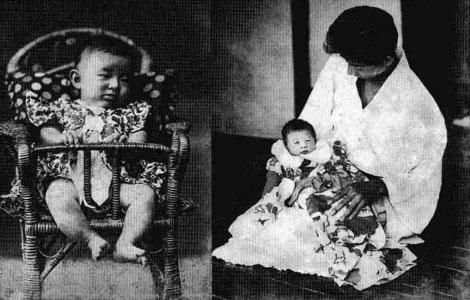 (右:下山一懷抱初生的長女下山和代,左:次女典子會坐童椅了)