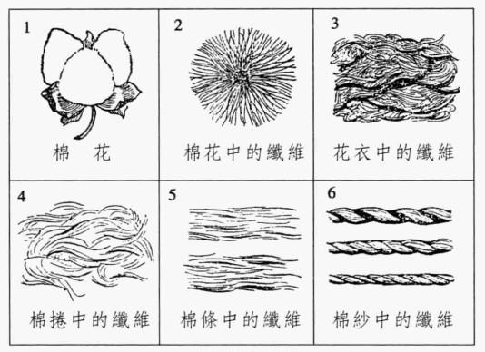「棉是我們織布時最重要的一種材料,這是一種叫做棉樹的溫帶植物所生產的。它是一種草本灌木,高約一米到兩米。它的大黃花心內,有著許多果實般的棉團,各個棉團都像雞蛋般大,飽含著絲質的棉絨,這種棉團有些是雪亮的,有些帶點淺黃色,要看棉的品種而定。在這些棉團的中央,是棉的籽。」