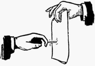「第一步,你們把一張普通的硬紙,從長邊對摺起來;然後把雙層紙的兩端拿在手中。第二步把這張紙放到火爐上,或一堆熱火上烘,要烘得剛好不灼焦。烘得愈是熱,則電產生得愈是多。最後,把仍執著兩頭的紙層,在它極熱時放上一塊絨布,很快地摩擦,這塊絨布應預先烘暖了,和_圖_書展放在膝上。倘若褲子也是絨布做的,它就可以在這上面擦。摩擦一定要做得極快,並且要順著紙的長條。擦了一會兒之後,一手把紙趕快提起來,這時應特別當心,不要讓紙條觸到任何東西;假如觸到了什麼,電便立刻分散了。此時趕快以空著的一隻手的指節和_圖_書,最好用一個鑰匙,放近紙條的中心;你們即將看見一點亮晶晶的火星,從紙上射到鑰匙上,有著一點輕微的爆聲。要再來一個火星,你們得重新來一回同樣的程序,因爲手指或鑰匙碰到紙上時,紙上所有的電便都消失了。