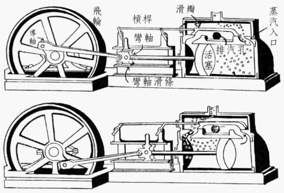 「那活塞像是一塊圓鐵餅,中間裝一根鐵棍,從圓筒一端所開的孔中穿出筒去,那孔的大小開鑿得剛好足使那鐵棍通過,而不使蒸汽洩漏。這根鐵棍相連著的彎軸是活動的,好像我們手臂關節那樣,最後那彎軸才連到附近的輪盤上。在這幾幅解剖圖上,所有東西都能很容易地看出來。那活塞在圓筒內交替著進退,把彎軸推前與拉後,彎軸則使那巨大的輪盤轉動。在火車頭的另一面,第二個圓筒發生著同樣的動作。於是那兩個大輪盤同時轉動起來,火車頭便向前移動了。」